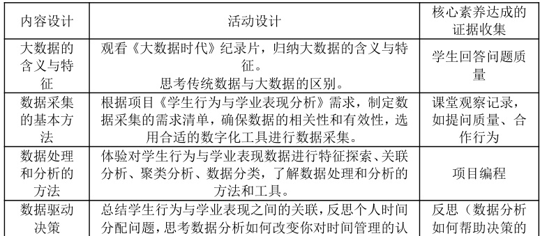通过基于学科核心素养的项目学习,学生经历从据采集工具、分析工具和可视化工具基本操作技能操作到问题解决的进阶式实践。通过完成数据清洗、整理、计算等标准化操作以及数据透视、统计检验(如相关性分析)或机器学习(如聚类分析),挖掘行为与学业表现的潜在规律,形成可解释的结论,培养以数据驱动决策的核心素养。单元教学是落实核心素养的有效载体,教师需从“知识传授者”转向“素养引导者”。在教学过程实践过程中,也存在不少的问题和挑战,如跨学科单元设计、技术支持下的个性化学习与有效评价仍然存在显著提升空间。