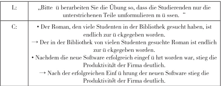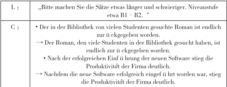 这轮对话有效补充了其他重要语法结构,使练习形式更加丰富,有助于更全面地训练学生多句法转换能力。Schritt 4: 形式调整 - 局部改写,突出目标结构为降低学生的认知负担,聚焦目标语法点,教师还可以将题目要求由整句转写改成局部划线改写,明确学生需要处理的语法结构: