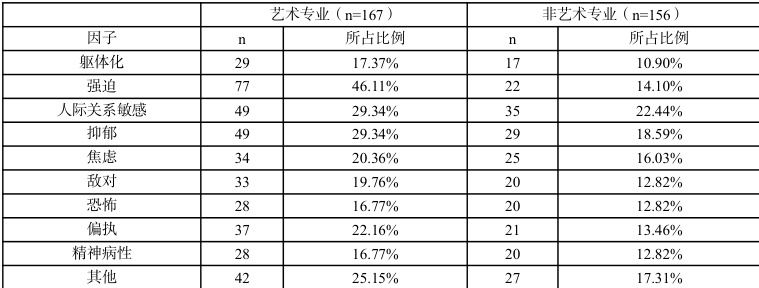 在有效调查问卷中,非艺术专业大学生SCL-90 总分最大值为264 分,最小值为90 分,平均(114.95±26.81)分,以SCL-90 总分大于或等于160 分作为心理检出阳性标准,非艺术专业大学生有明显心理健康问题者8例,其中男生4 例,女生4 例,检出率为 5.13% (8/156);艺术生专业大学生SCL-90 总分最大值为 185 分,最小值为90 分,平均( 114.81±26.71 )分,艺术专业大学生有明显心理健康问题者20 例,其中男生5 例,女生15 例,检出率为 11.98% 。以SCL-90 单个因子大于或等于 2 分为筛查阳性,对艺术专业和非艺术专业大学生各因子中阳性因子例数的分布及在总人数中的百分比进行统计分析,其中艺术专业大学生阳性症状出现概率最多的是强迫,其次依次是人际关系敏感、抑郁、其他、偏执、焦虑、敌对、躯体化、恐怖和精神病性;而非艺术专业大学生阳性症状出现的概率由高到低依次是人际关系敏感、抑郁、其他、焦虑、强迫、偏执、敌对、恐怖、精神病性和躯体化。见表 1 。