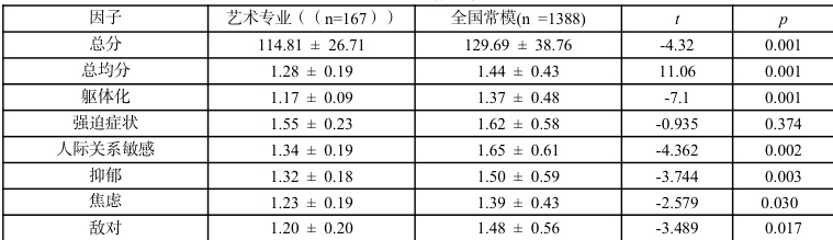 2.2.艺术专业大学生SCL-90 测试结果与常模评分比较