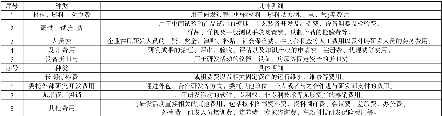 研发费用是指企业在进行新产品、新工艺、新材料等的研究开发 过程中发生的各项费用。费用种类一般包括 8 大类,详见图表 1。