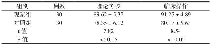 观察组的理论与操作成绩显著优于对照组( P<0.05 )。详见表 1。表 1 两组实习医师考核成绩比较( X±s ,分)