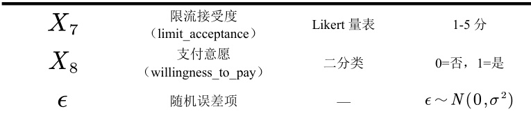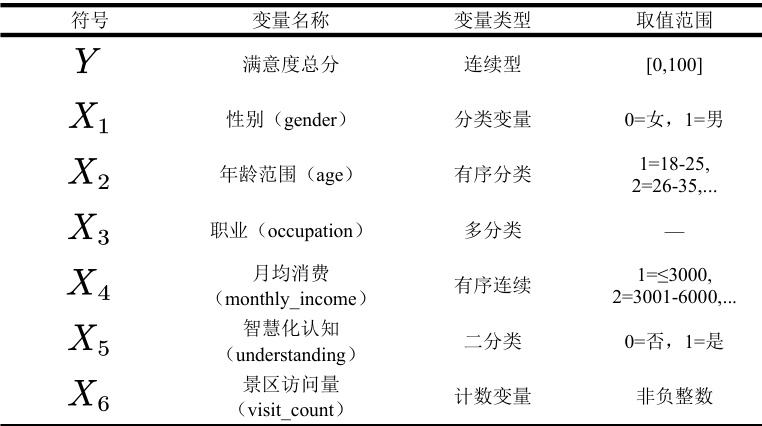 基于多元线性回归模型的核心假设构建分析框架。首先,假设综合满意度,由住宿、交通、餐饮等维度评分均值构成的因变量与连续型自变量间存在线性关系,分类变量满足线性可加性;其次,确保自变量间无严重多重共线性,且数据不存在系统性测量误差。最后,样本需独立采集并覆盖目标人群特征空间,确保分析结果的代表性。具体回归方程表达为: