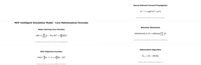 深度学习损失函数结合了均方误差和L2 正则化项,有效防止过拟合并提高模型泛化能力。 MCP 目标函数采用多约束优化形式,同时考虑成本最小化和约束满足。神经网络前向传播公 式描述了层间信息传递过程,其中σ表示激活函数。注意力机制公式实现了对输入特征的加权 处理,突出重要信息。优化算法采用梯度下降法更新模型参数。