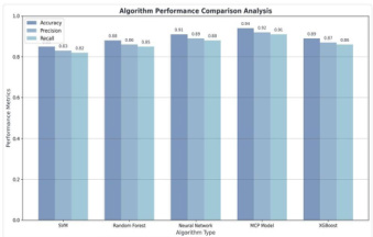 为了全面评估 MCP 智能仿真模型的性能,本文将其与四种主流算法进行了对比实验,包括支 持向量机(SVM) 、 随机森林 (Random Forest) 、神经网络 (Neural Network) 和 XGBoost 。评估指标包括准确率、精确率和召回率。