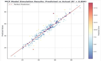 图 5 展示了MCP 模型的预测结果与实际值的对比情况。散点图中的点按预测误差大小进行了颜 色编码,R²系数达到0.896,表明模型具有很强的预测能力。大部分数据点都分布在理想预测 线附近,预测误差较小。