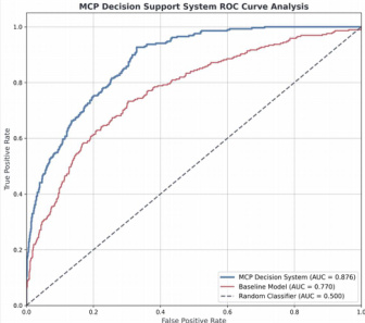 为了评估MCP 智能仿真模型在决策支持方面的性能,本文采用 ROC 曲线分析方法。图 7 展示 了MCP 决策支持系统与基线模型的 ROC 曲线对比。MCP 系统的AUC 值达到0.876,明显优于 基线模型的 0.731,表明该系统具有出色的分类性能和决策支持能力。