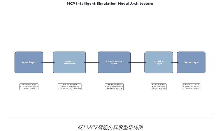 本文提出的MCP 智能仿真模型采用分层架构设计,包含五个主要层次:输入层、特征提取 层、深度学习层、决策层和输出层。每层都有特定的功能和作用,通过有机结合形成完整的 智能仿真系统。
