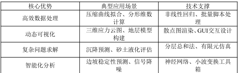 6.优势对比。通过集成数值计算、可视化建模与智能算法,MATLAB显著提升了公路岩土工程勘察的数字化水平与决策效率,适应绿色低碳与智能化发展的行业趋势。
