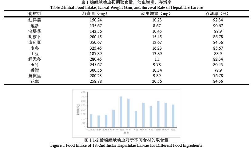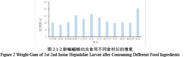 如图1 将1-2 龄的蝙蝠蛾幼虫分别使用不同的食料进行饲养后发现1-2 龄的蝙蝠蛾幼虫对于红洋姜、地参、宝塔菜等富含膳食纤维的食材,取食量相对较低,而对山药豆这类淀粉含量较高的食材,取食量较高。