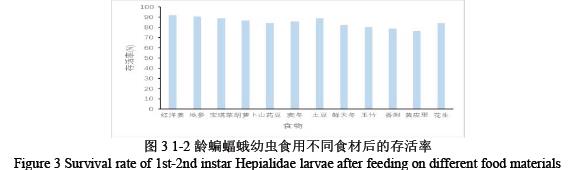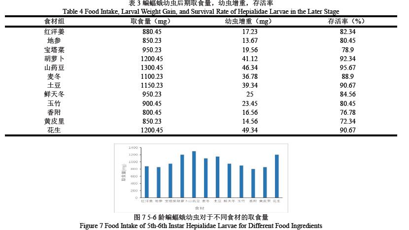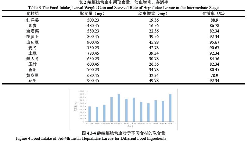 如图3,1-2 龄的蝙蝠蛾幼虫在存活率方面:红洋姜、地参组的取食量虽然较低但是存活率最高92.34%、90.67%,可能与其药用成分对幼虫的保健作用有关;香附、黄皮里组存活率较低78.90%、76.78%,可能与特殊气味或营养成分不适有关。但从图中可以看出无明显低存活率的食材,显示这些食材都能较好支持幼虫生存。