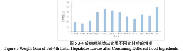 如图5 可知,将3-4 龄的蝙蝠蛾幼虫分别使用不同的食料进行饲养后发现3-4 龄的蝙蝠蛾幼虫食用花生增重最显著49.79mg,山药豆、麦冬组次之,地参的增重最低只有16.56mg 说明高增重食材如花生更容易满足蝙蝠蛾幼虫中期的快速生长需求;而低增重食材如地参、红洋姜在营养成分或消化吸收层面可能存在不足,对幼虫生长的促进作用较弱。