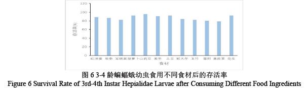 如图 6 可知,将 3-4 龄的蝙蝠蛾幼虫分别使用不同的食料进行饲养后发现 3-4 龄的蝙蝠蛾幼虫在存活率方面:山药豆、花生、土豆、胡萝卜、麦冬组存活率较高分别为 95.67%、92.34%、92.34%、92.34%、 90.67% ,黄皮里、香附组的存活率较低分别为 78.90%、80.45%,可能与食材中特殊成分影响幼虫代谢有关。但是无显著低存活率的食材,表明实验食材均能满足 3-4龄蝙蝠蛾幼虫的基本生存需求。