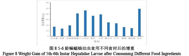 如图8 中可得,将5-6 龄的蝙蝠蛾幼虫分别使用不同的食料进行饲养后发现5-6 龄的蝙蝠蛾幼虫,其中花生组增重最显著49.34mg,山药豆、胡萝卜组等次之,地参和黄皮里的增重最低13.67mg,14.56mg。说明高蛋白质与脂肪食材对后期幼虫增重仍重要。