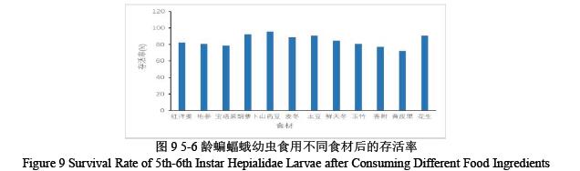 如图 9 表示,蝙蝠蛾幼虫食用山药豆后存活率最高 95.67% ,而食用黄皮里存活率最低 72.34%,提示后期幼虫对食材选择更挑剔,营养平衡与适口性影响存活。但是无显著低存活率的食材,表明实验食材均能满足 5-6 龄蝙蝠蛾幼虫的基本生存需求。
