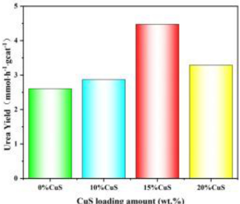 如图4 所示,CuS含量为 15% 的材料性能最高,尿素产量达到 4.475 mmol·h-1·gcat-1。在对比实验测试中(图 5),实验在无 KNO3 、无 CO2 、无催化剂的条件下进行, Yq1CO2 和硝酸盐的反应物之一不存在时,尿素不能在体系中合成,这表明 CO2 和硝酸盐是尿素合成的C和N源。
