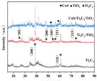 如图 1 所示,在 38.7∘ 和 60.8∘ 的主信号分别为MXene的(200)和(110)平面,在 25.3∘ ,48.0∘ , 53.8∘ 、 55.0∘ 和 74.0∘ 分别锐钛矿的(101),(200),(105)、(211)和(215)平面。CuS/Ti3C2/TiO2 的XRD显示出属于CuS、 Ti3C2TxFHTiO2 的衍射峰。此外,观察到三种材料的衍射峰狭窄而且尖锐,说明这三种材料的结晶度较好。