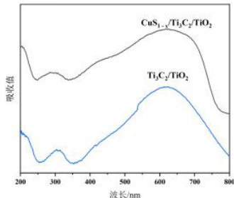 如图 2 所示,两种材料在全波段波长范围内之间都有较明显的吸收峰,在波长400⋅750nm 范围内对光吸收最显著,表明两种材料均具有可见光响应和催化性能。但CuS1-x/Ti3C2/TiO2 材料的吸收波长范围较 Ti3C2/TiO2 更长,吸收强度也更大,说明CuS的复合提高了 Ti3C2/TiO2 的光吸收能力。