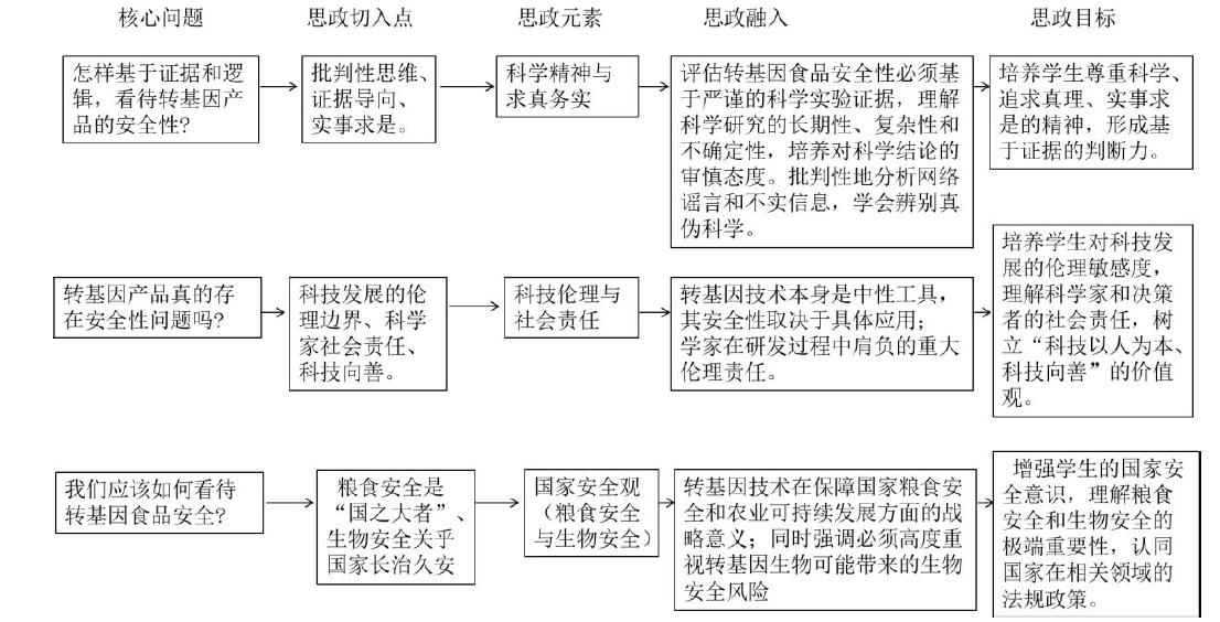 课程思政要求学科教师有计划的将教学内容和思政元素巧妙的融合,所以在课程设计的过程中有必要构建课程思政体系图,该图可以指导老师明确课程思政的各个环节。课程思政体系图的设计可以分三个环节[6]:首先明确思政元素与思政目标;其次是确定融入的知识点;第三是明确思政融入方法。如在选择性必修3《转基因食品的安全性》这一节的教学内容中我们就可以构建如下思政体系图: