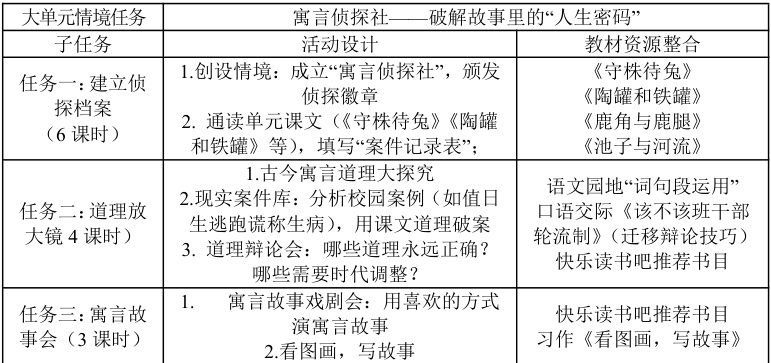 基于以上问题,本单元设计大单元情境任务设“寓言侦探社——破解故事里的‘人生密码’”,以“小侦探”身份沉浸式学习寓言,关联现实生活矛盾,通过“发现问题—分析规律—解决问题”的思维链条,理解寓言道理的动态应用。