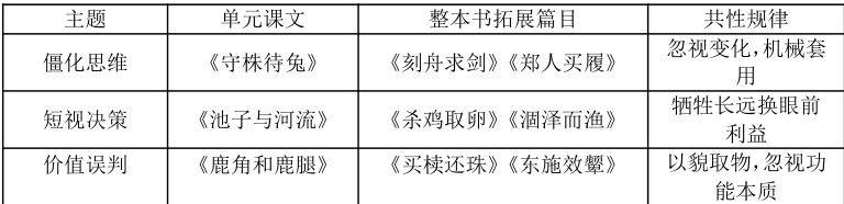 从问卷调查情况看,现有教学侧重单篇寓言理解,未建立“故事-道理-现实”的立体联结。以单元四篇寓言为基点,拓展阅读《快乐读书吧》同类主题故事。纵向深挖(链接《快乐读书吧》整本书阅读)如表 2 :