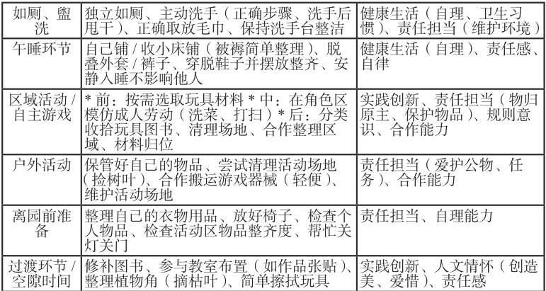 环境维护(整理玩具、照料植物) $$ 指向“责任担当”(爱护环境)、“学会学习”(观察、照顾)。