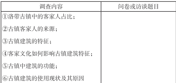 此环节学生将针对洛带客家文化与建筑现状自行设计问卷或访谈提纲题目设计。(提示:问卷应包含基本情况与调查问题,问题尽可能做到科学、简明、不产生歧义;问题紧扣调查主题。)