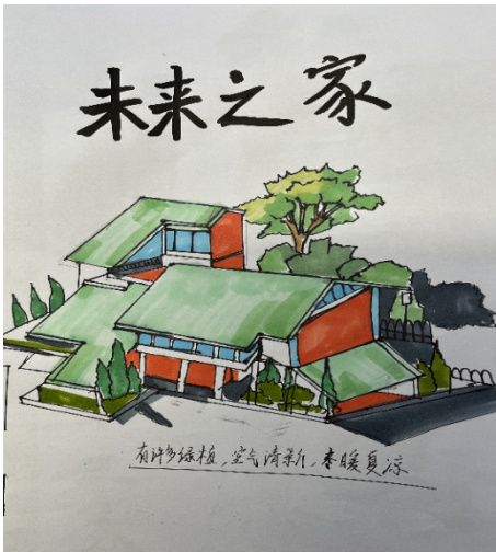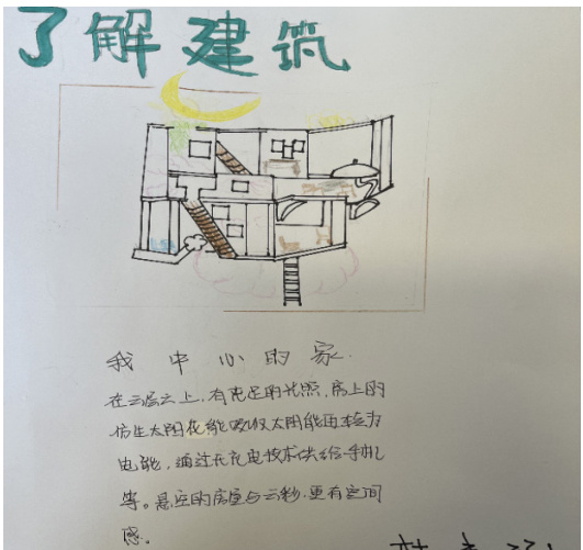在这个环节中,学生被鼓励思考未来的民居建筑应该如何设计,以适应变化的自然环境和文化需求。教师引导学生探讨可持续发展的概念,如如何在未来保护传统文化并促进可持续发展。学生展示了创造性的想象力,提出了各种创新的设计理念,包括使用环保材料、智能化设计和可再生能源的应用。这个环节培养了学生的创新思维和可持续发展意识。图5 和6 展示了两幅学生作品。
