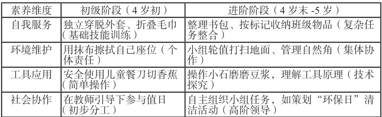 教育部发布的《关于全面加强新时代大中小学劳动教育的意见》及《幼儿园保育教育质量评估指南》明确要求将劳动教育融入幼儿一日生活,强调从幼儿期培养劳动习惯和素养。当前幼儿园劳动教育普遍存在形式化、片段化问题,如活动仅限于课堂模拟或孤立任务,脱离幼儿真实生活场域,导致劳动价值难以内化。具体表现为教师主导过度,幼儿参与被动,无法实现核心素养的持续养成。以“自主探究、责任担当、问题解决、协作共创”为劳动教育目标(引用教育部《中国学生发展核心素养》文件),旨在培养幼儿的综合能力。以保育场景、生活环节和环境管理为载体,将劳动实践渗透于日常,如通过餐点准备、玩具整理等活动,让幼儿在真实体验中感知劳动意义。本研究针对中班幼儿发展特点,提出系统化实施策略,为劳动教育从“任务驱动”转向“素养生成”提供方法论支撑,填补实践指导的空白。