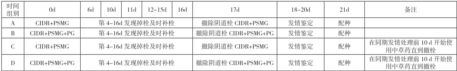 CIDR(醋酸氟孕酮阴道海绵栓)产地:郑州联想农牧贸易有限公司,PMSG(孕马血清促性腺激素)、PG(前列腺烯醇),产地:上海全宇生物科技动物药业有限公司。试验组在发情处理前 15 d 使用中草药,中草药配方为:当归