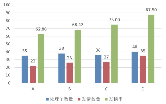 将选择好的试验母羊随机分成四组,A 组,35 只,使用 CIDR+PSMG 处理;B 组,38 只,使用 CIDR+PSMG+PG 处理;C 组,36 只,使用 CIDR+FSH 处理,同时饲喂中草药;D 组,40 只,使用 CIDR+PSMG+PG 处理,同时饲喂中草药,观察处理效果。