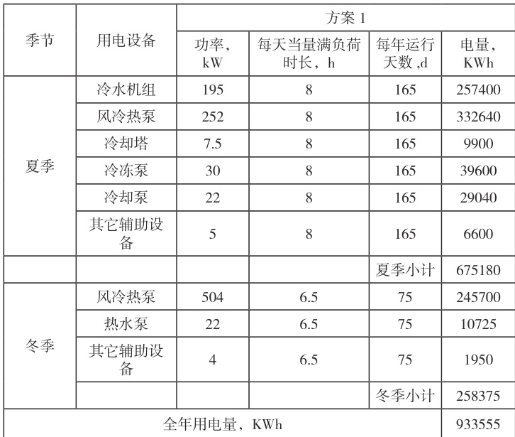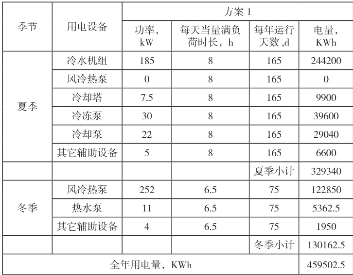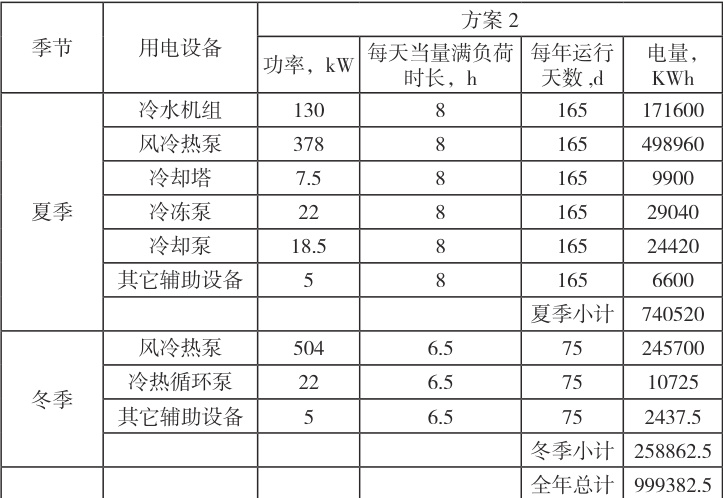 2.2 方案 2 能耗计算项目投入的前 5 年,方案 2 夏季采用磁悬浮冷水机组 + 风冷热泵机组供冷,运行的设备有:冷却塔、一体式输配系统(冷却、冷冻水泵、软水机)、磁悬浮冷水机组、风冷热泵机组、风冷热泵配套水泵及末端设备等。