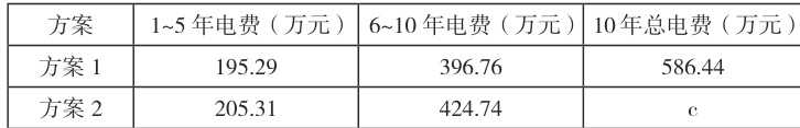 从表中数据可知,方案 1 的 10 年运行总电费为 586.44 万元,方案 210 年运行总电费为 630.05 万元。通过对比,方案1 比方案2 节约43.61 万元。根据业主提供的资料,本项目的空调服务收费为 60 元 /m²。1~5 年,空调收费面积为 1 万平米,6~10 年空调收费面积为2 万平米。