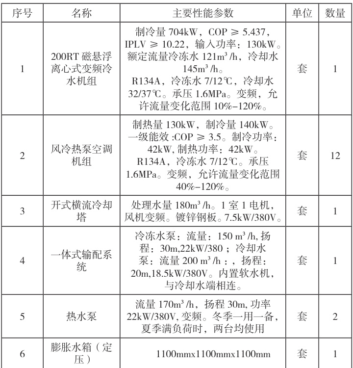 1 :磁悬浮离心式冷水机组;2 :一体式输配系统(内含冷却泵、冷冻泵);3、冷却塔;4、风冷热泵;5、热水泵;6、膨胀水箱