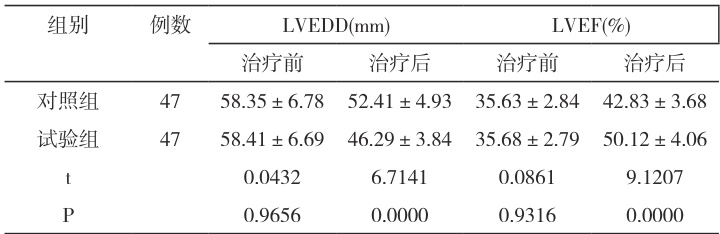 对比两组心功能,治疗前,无明显差异( P>0.05 ),治疗后,试验组LVEDD 更低,LVEF 更高( P<0.05 ),见表1。