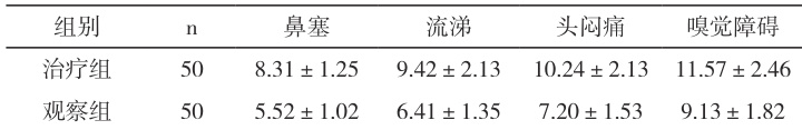 (1)主要症状改善时间:研究人员系统记录两组受试者四项核心症状(鼻腔通气障碍、异常分泌物、头部闷胀感、嗅觉功能异常)的缓解时间。