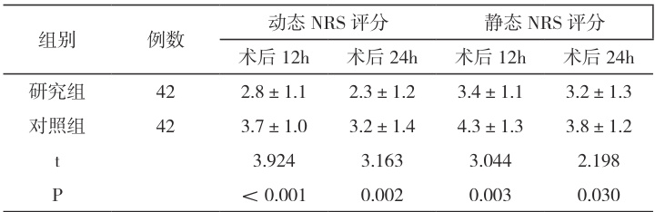 两组患者采用不同的镇痛方法后,研究组动态和静态 NRS 评分均低于对照组, P<0.05 ,差异性显著。见表 1 :