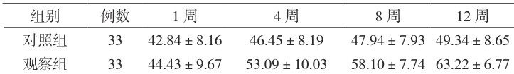 观察组患者在强化中医慢病管理后,1 周随访服药依从性结果与对照组对比显示 P>0.05 ;而在随访 4 周、8 周、12 周的服药依从性结果明显高于对照组患者 P<0.05 。详情见下表 2.