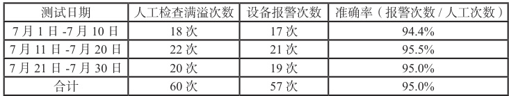 ·测试指标:设备故障率(是否断连、数据是否丢失)、满溢监测准确率