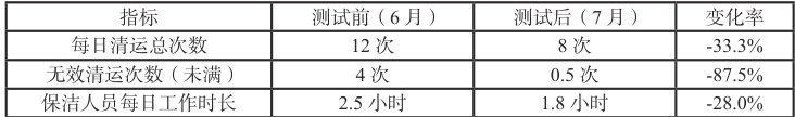 (与人工检查结果对比)、供电续航时间、清运效率变化(测试前后无效清运次数对比)。