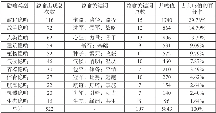 本研究采用了语料库软件识别和人工识别相结合的方法来进行隐喻的识别工作,其中人工识别的方式遵循了 Steen et al.(2010)的MIPVU隐喻识别程序。在隐喻理解阶段,识别概念隐喻并进行统计、分析和归类,确定隐喻关键词。根据 Charteris-Black(2004)提出的“源域共鸣值(Resonance) =Σ type(隐喻关键词总数)