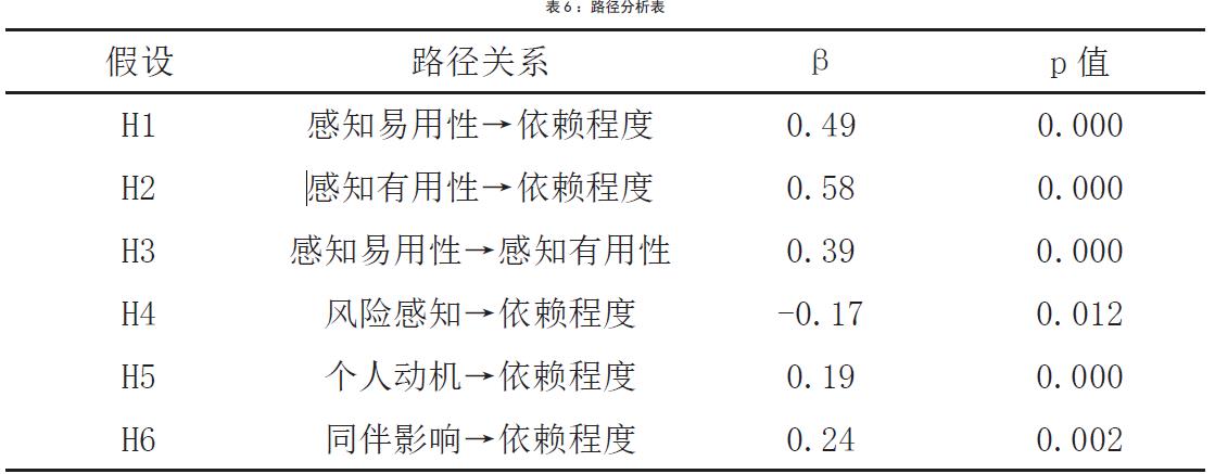 路径分析结果显示,感知易用性、感知有用性、个人动机、同伴影响对依赖程度正向支持,假设 H1、H2、H5、H6 成立;感知易用性对感知有用性正向支持,假设H3成立;风险感知对依赖程度负向支持,假设 H5成立。综上,本研究提出的假设均成立。