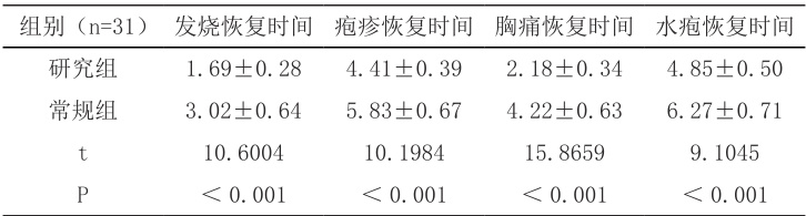手足口病各症状的恢复时间在研究组短于常规组,P<0.05。