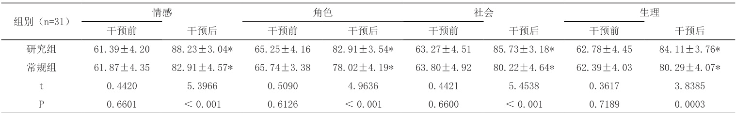 干预后生活质量评分增幅明显,组间评分显示,研究组高于常规组,P<0.05。