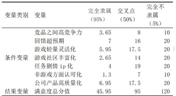 条件变量:以前文中的将竞品之间高竞争力、期待超预期、游戏轻量灵活化、游戏社区丰富化、任务剧情 ip 化、非游戏方面认可化(如游戏公司在传播中国传统文化方面的贡献)、公司产品高质量七大发展维度,采用直接校准法校准模糊集,以Ragin 的校准方法为准 [8] 选取样本数据的 5% 分位数作为完全不隶属的阈值、 50% 分位数作为交叉点、 95% 分位数作为完全隶属的阈值 [9],得到条件变量和结果变量的校准锚点如表4 所示。