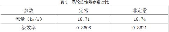 表 3 是涡轮性能的定常与非定常时均结果的对比,两者的计算结果略有差异,非定常的流通能力和级效率较高,但是压比略低于定常结果。
