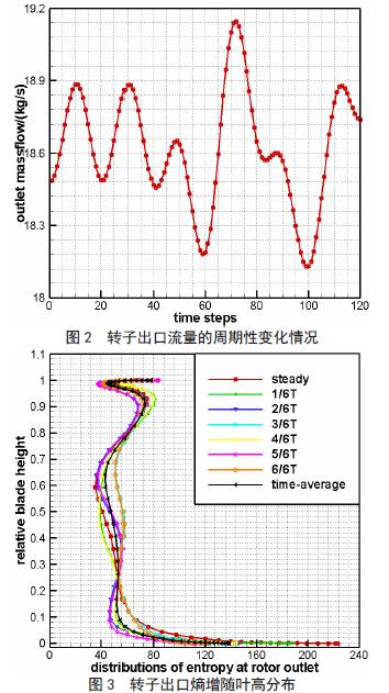 图 2 显示了涡轮转子出口流量在一个周期内随时间变化的波动曲线,横坐标是物理时间步,纵坐标是出口流量,可以发现出口流量随时间的变化非常明显。这表明,虽然在时均性能参数方面,非定常计算获得的结果与定常计算得到的结果差异不大,但是实际上,涡轮流场内部随时间的周期性变化是显而易见的,说明定常计算获得的流场结果是具有局限性的,并不能代表涡轮内部的真实流动。图 3 显示了涡轮转子出口处定常以及非定常六个时刻和时间平均获得的周向平均熵增随叶高分布的情况,从图 3 中也可以看出定常模拟得到的涡轮流场和非定常模拟结果存在显著差别。