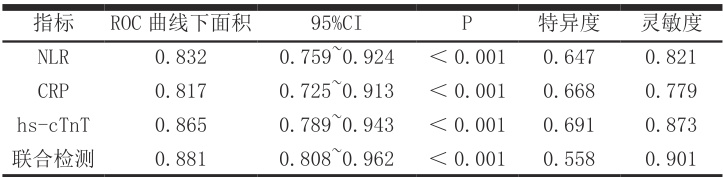 综上所述,通过 hs-cTnT、NLR 和 CRP 联合检测急性心肌梗死,可以提高诊断的灵敏度与特异性,便于为早期诊断与治疗提供参考依据。