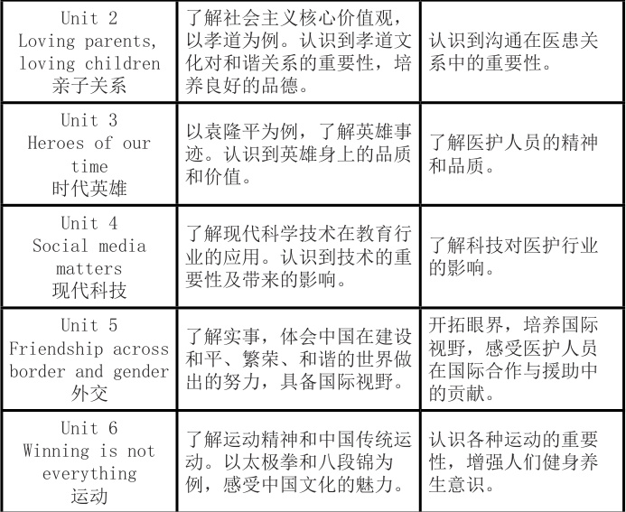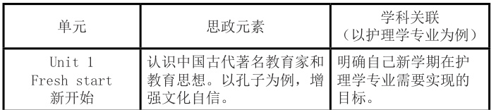 教师团队充分挖掘和提炼各单元的思政主题,并结合授课班级专业特色,体现与学科关联的思政元素。以《新视野大学英语读写教程1》和护理学专业班级为例,各单元思政元素和学科关联思政元素具体如下:
