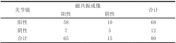 关节镜检查结果显示,80 例疑似膝关节前交叉韧带断裂受检者中检出阳性 68 例,阴性 12 例;磁共振成像检出阳性 65 例,阴性 15 例,所获结果对比未见明显差异 P>0.05 ,如表1。